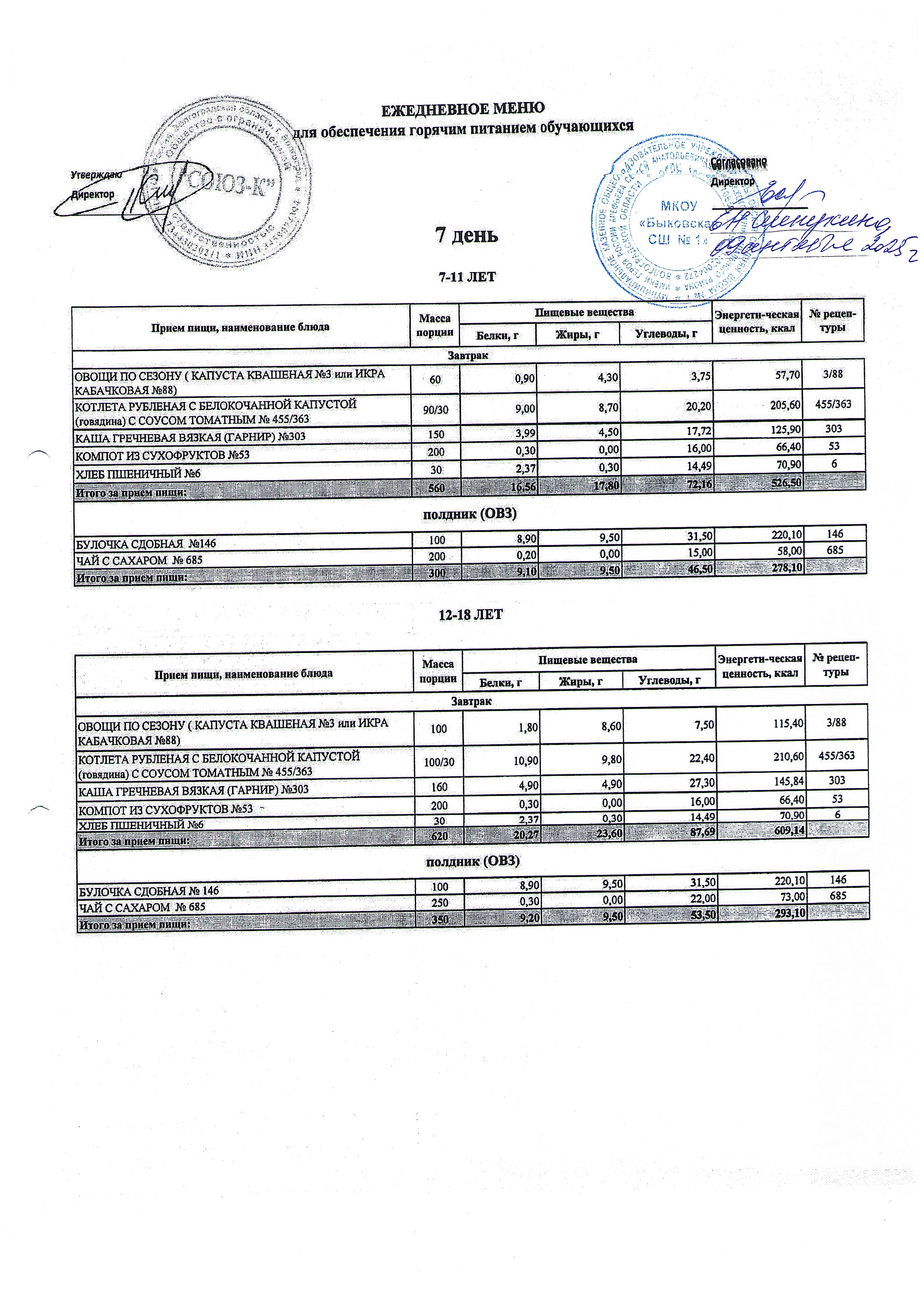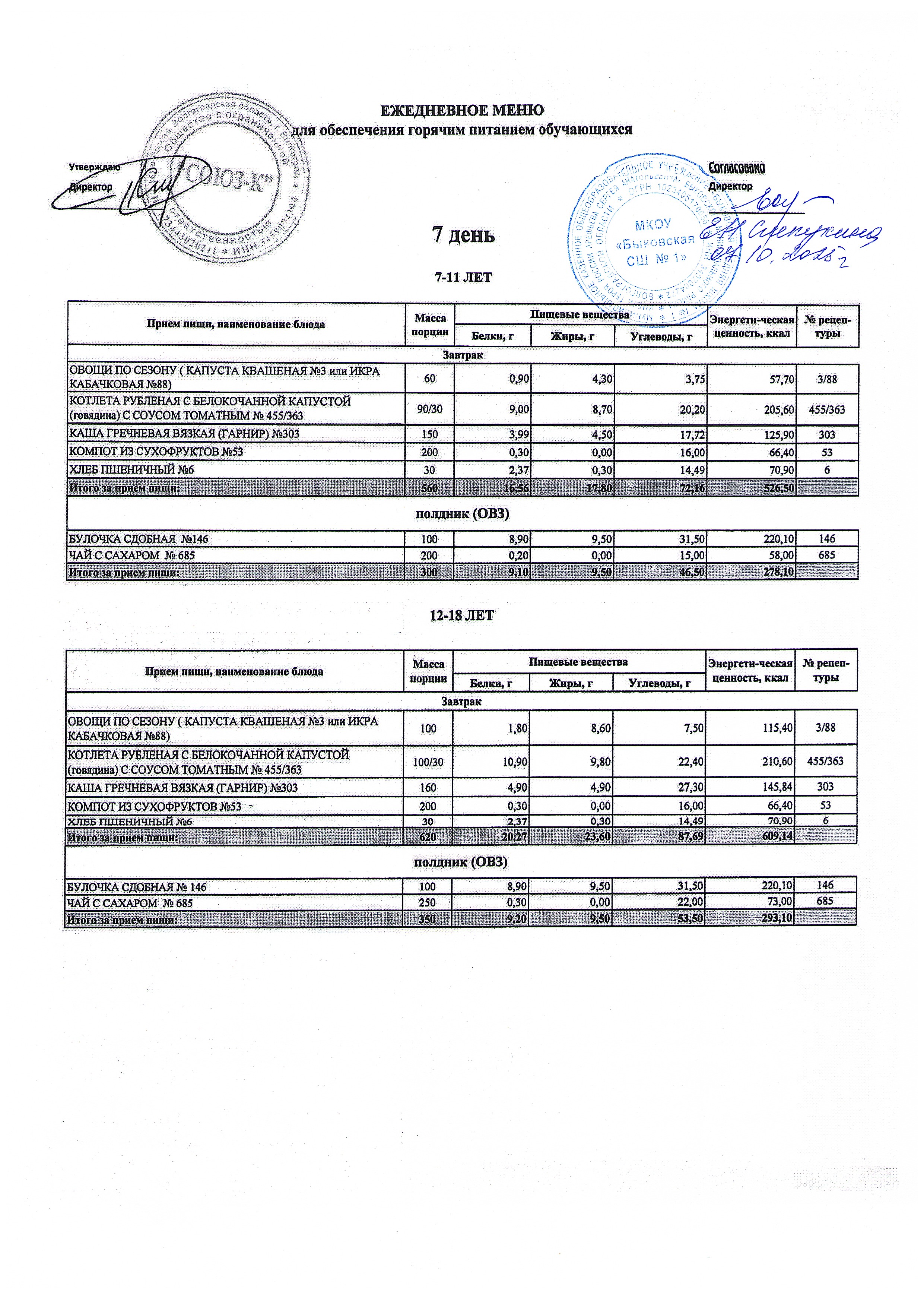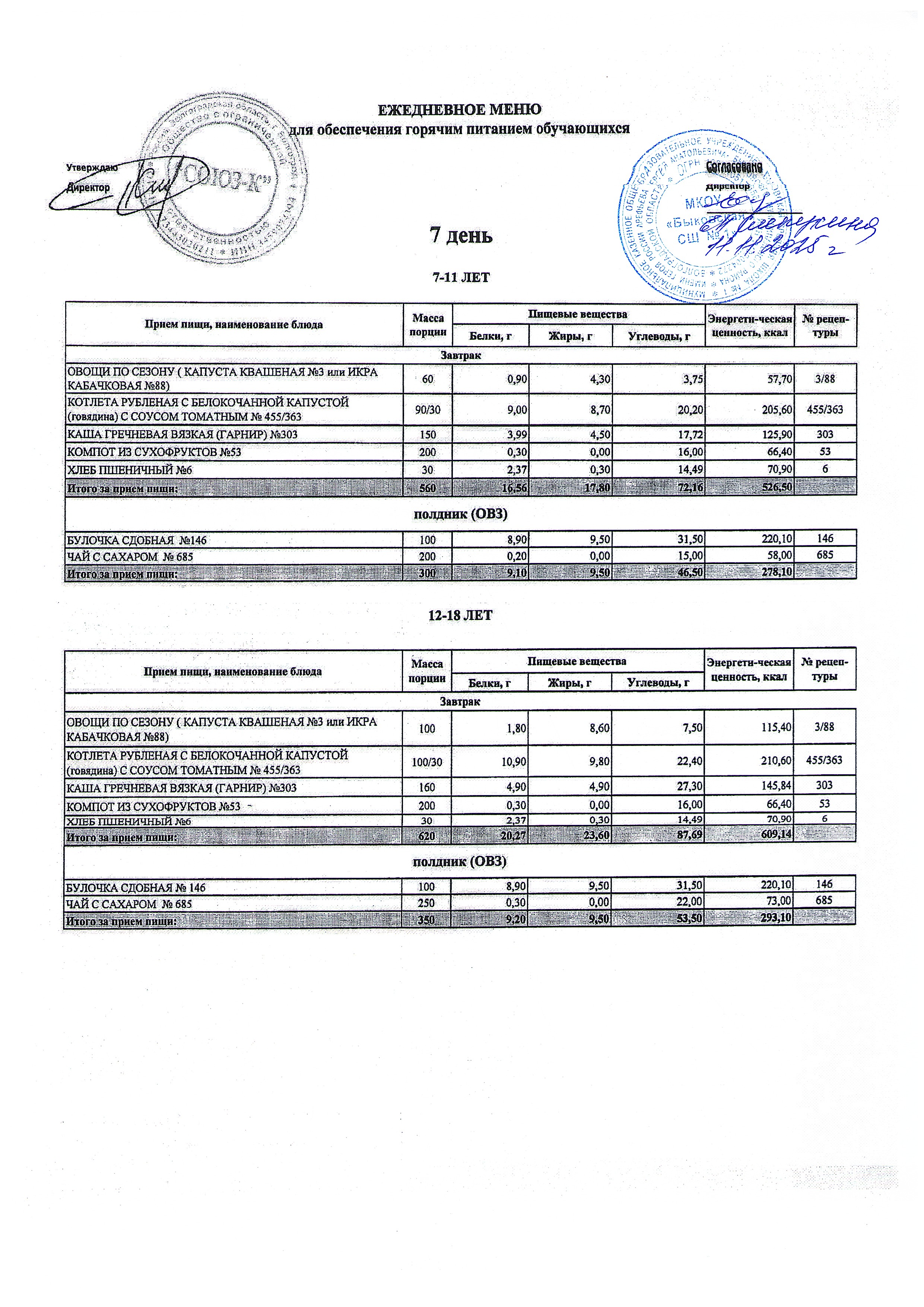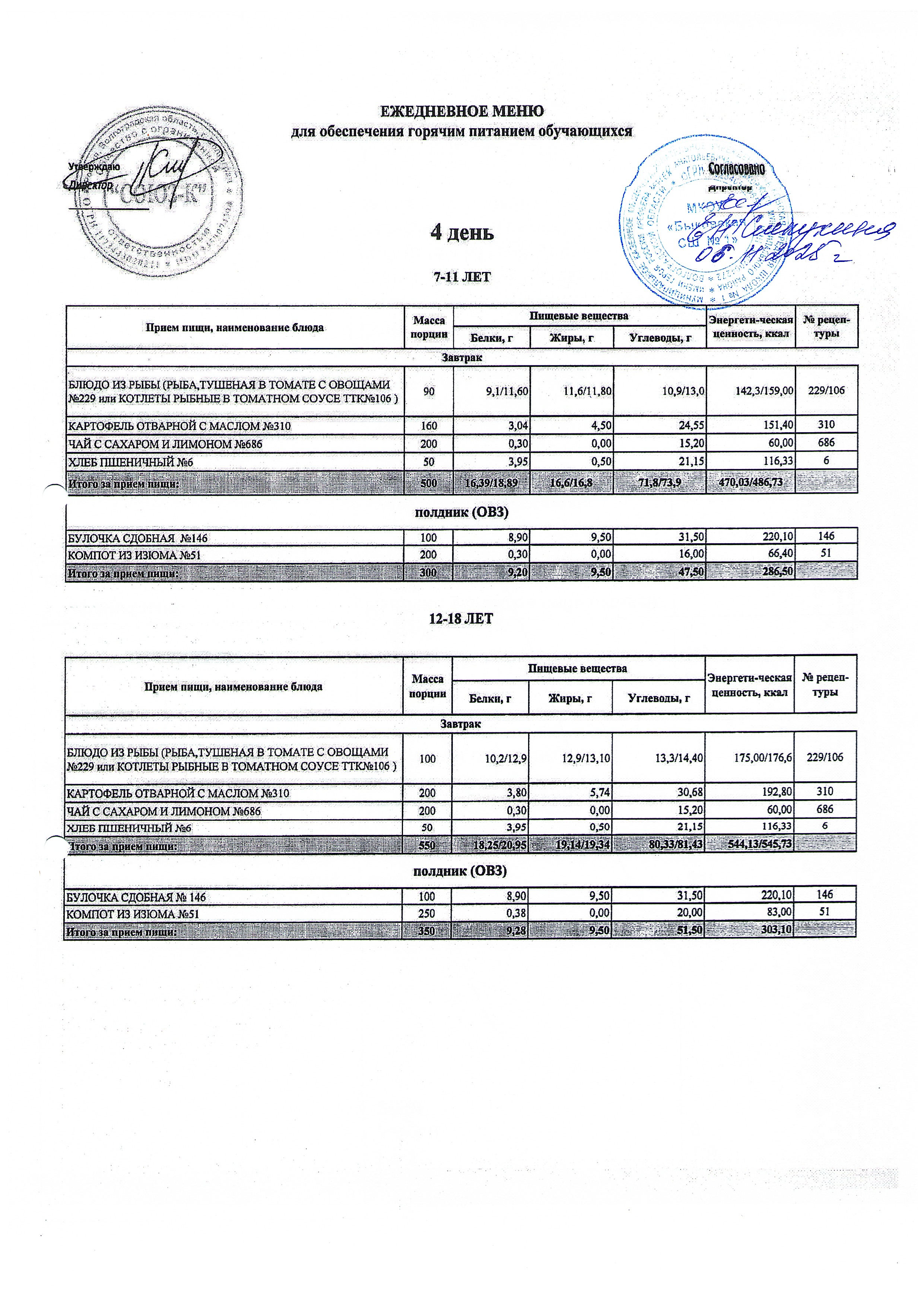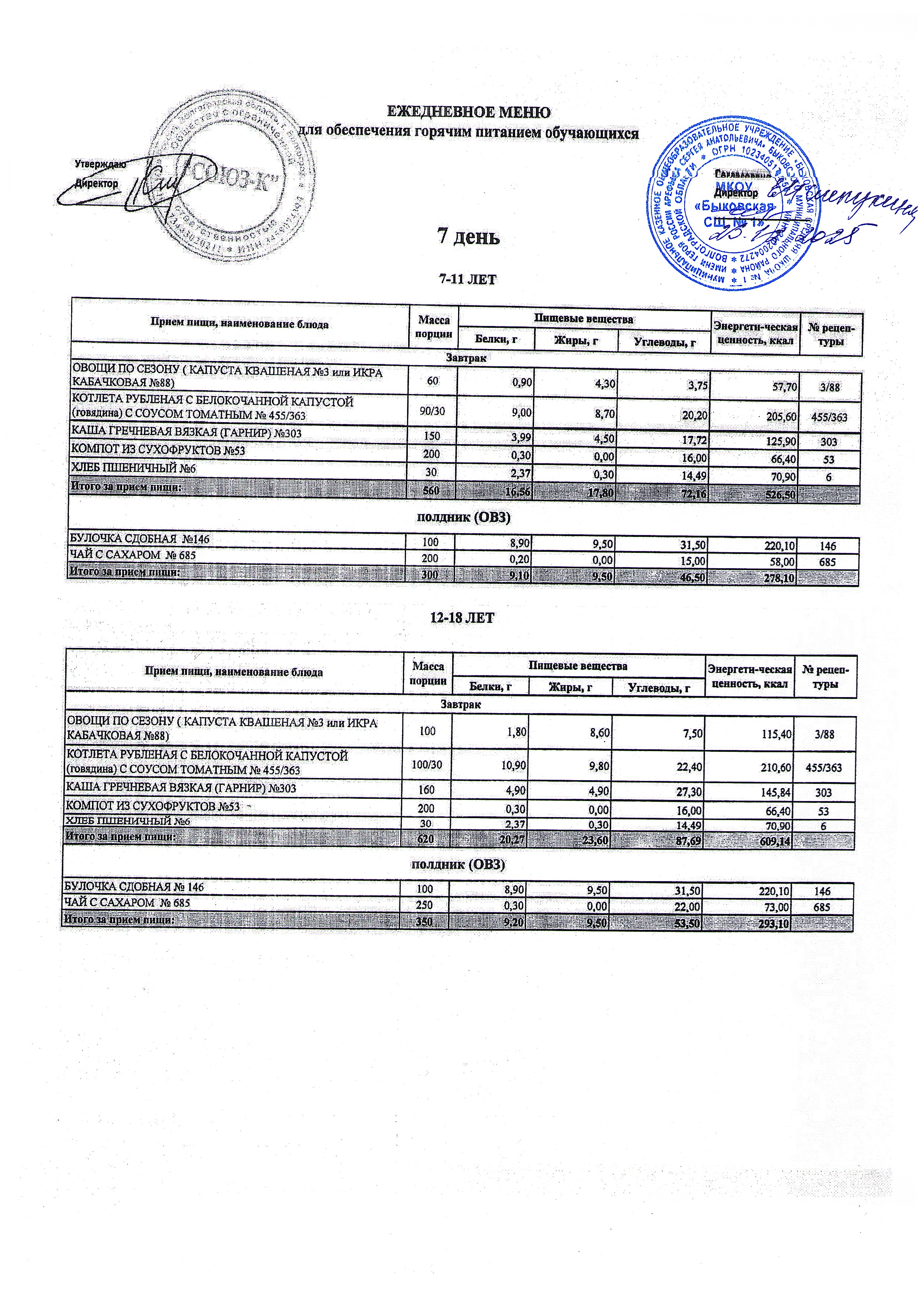 - примерное диетическое цикличное меню для 7-11 лет (1-4 классы) - отсутствует в ОО
