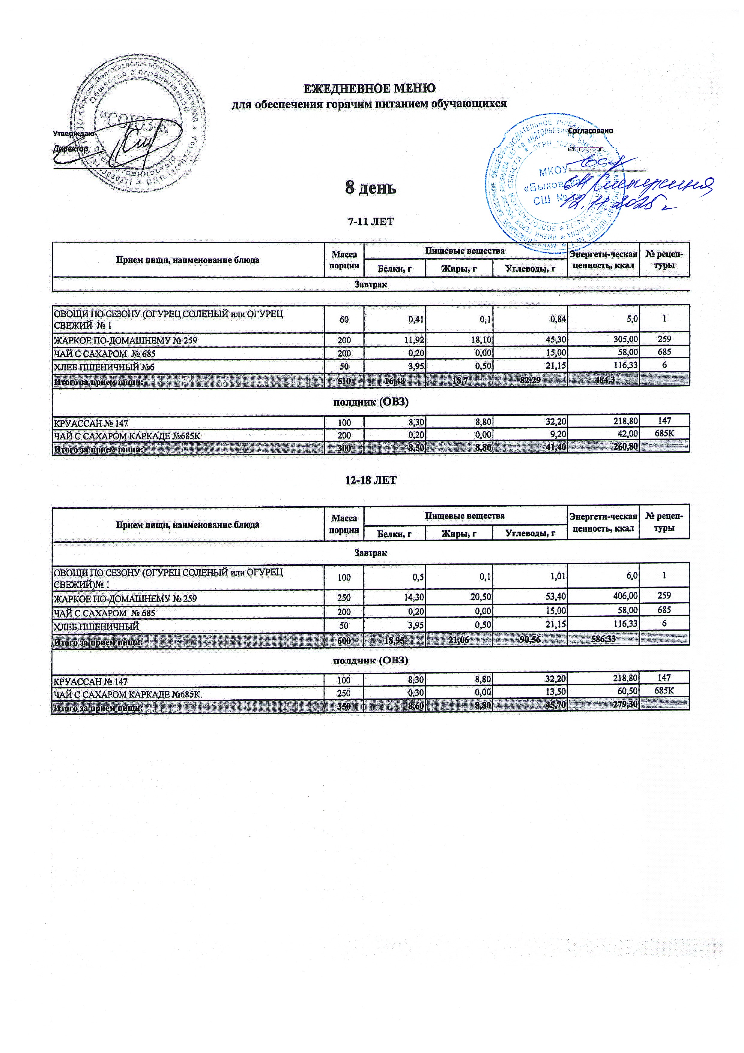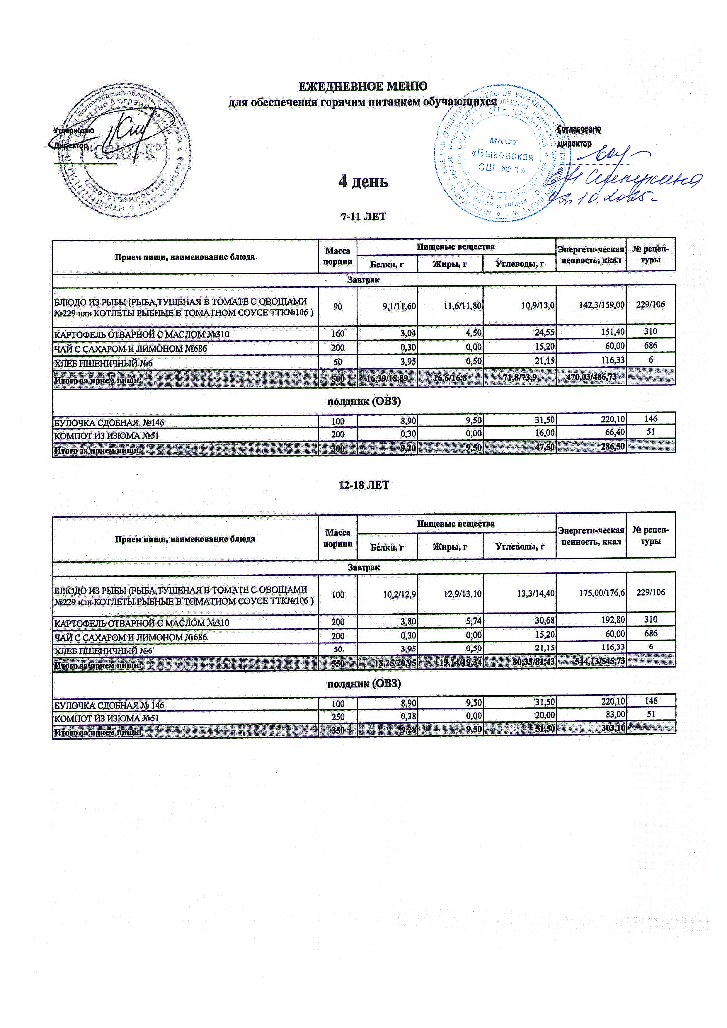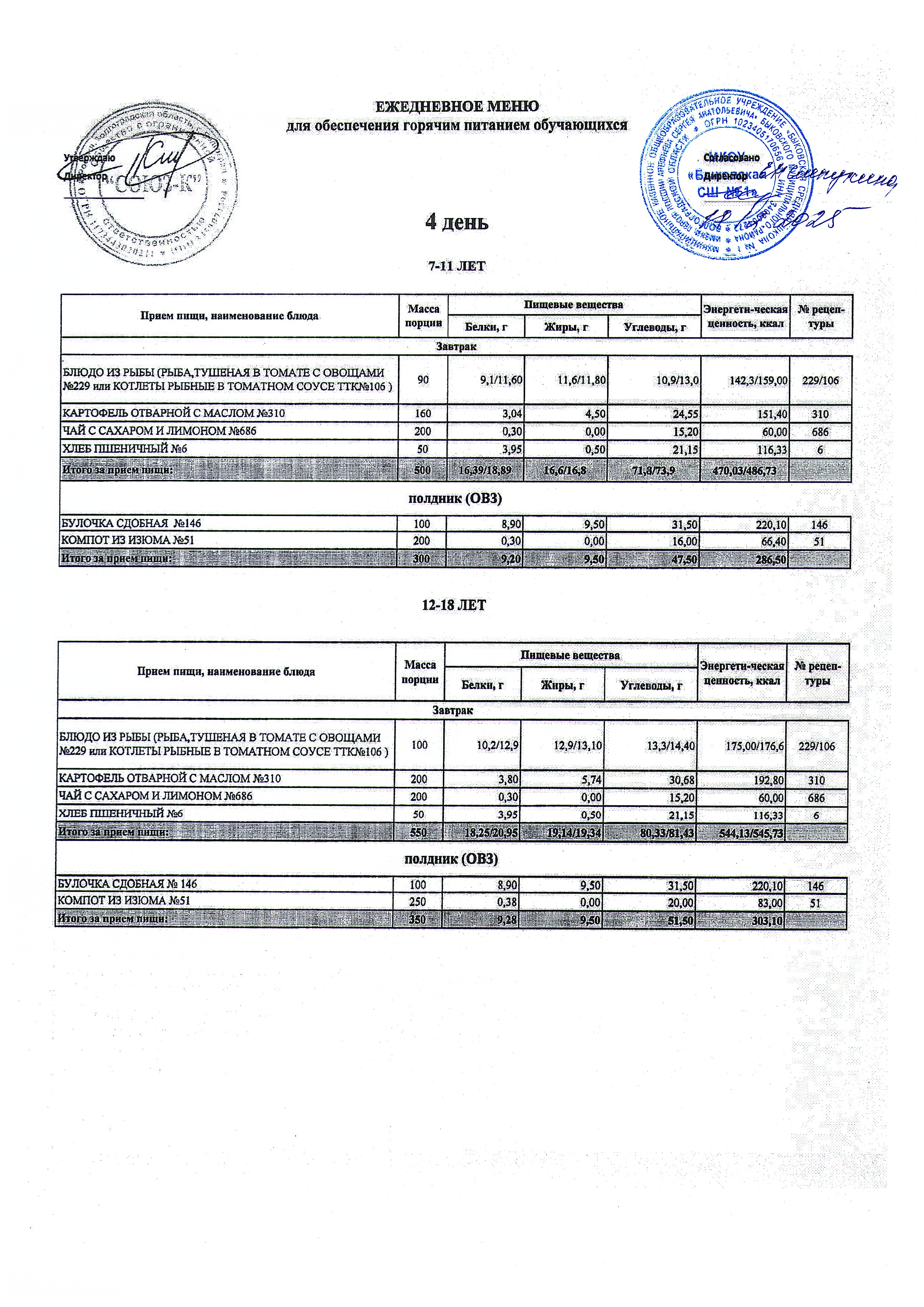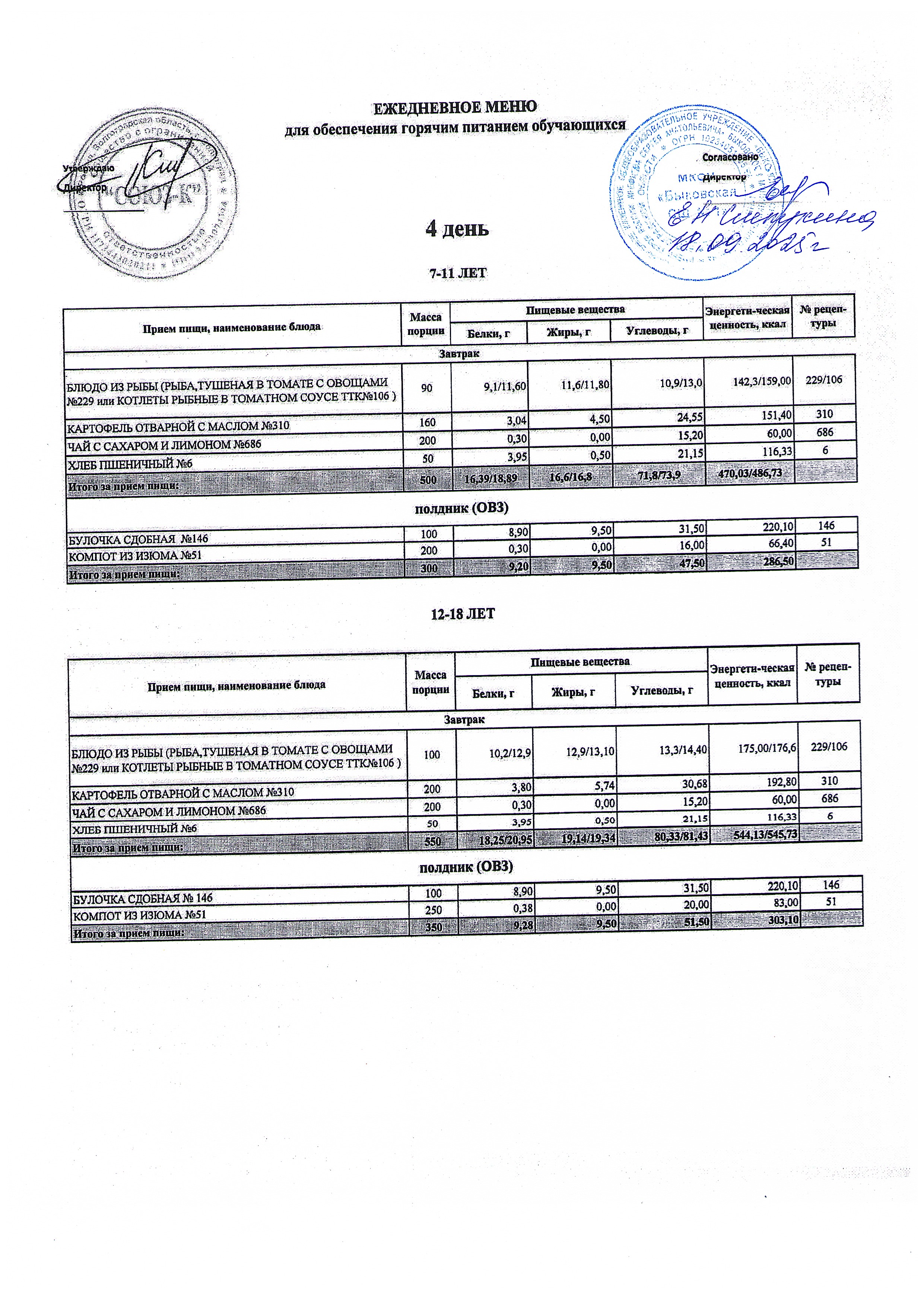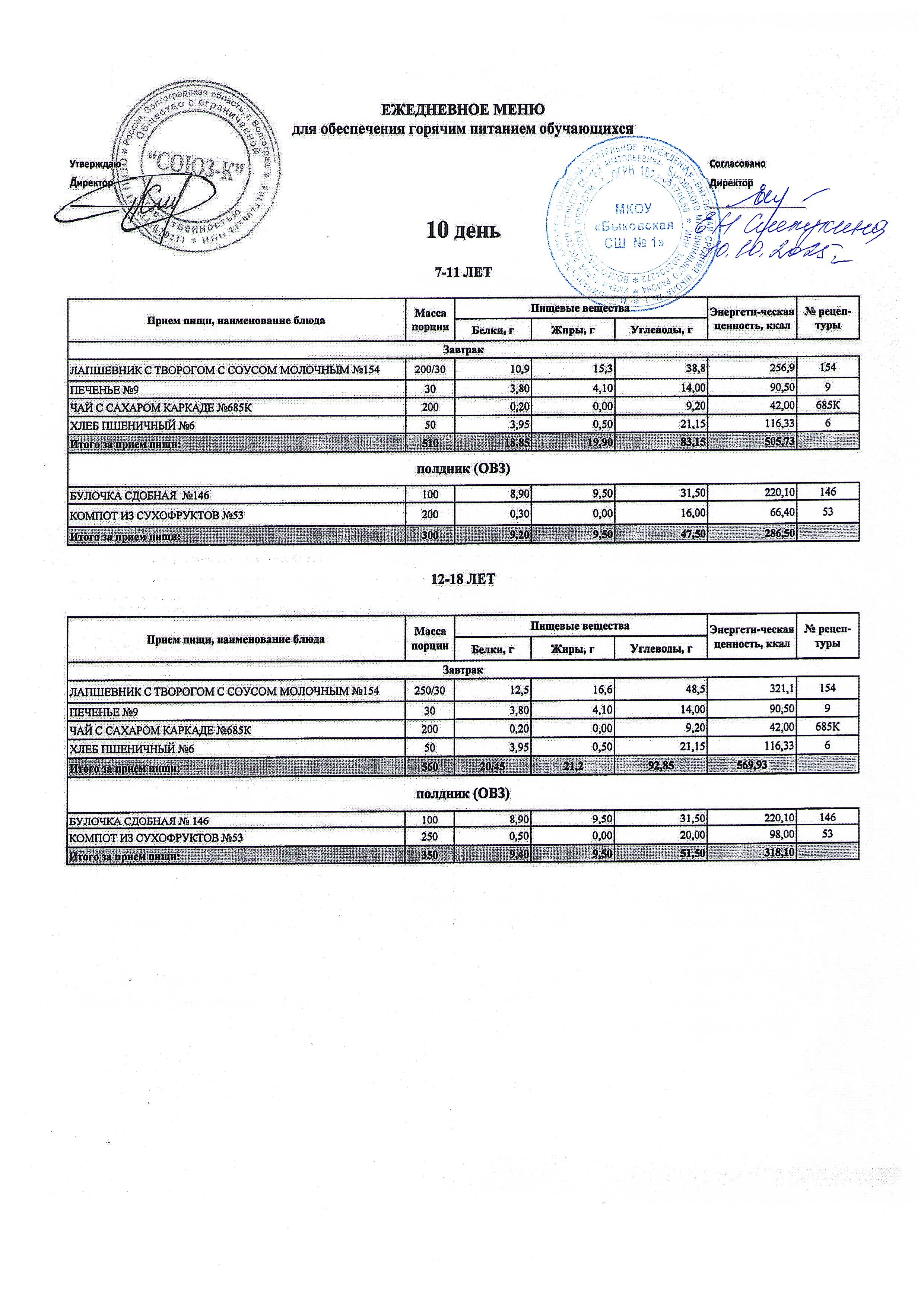 - примерное диетическое цикличное меню для 7-11 лет (1-4 классы) - отсутствует в ОО